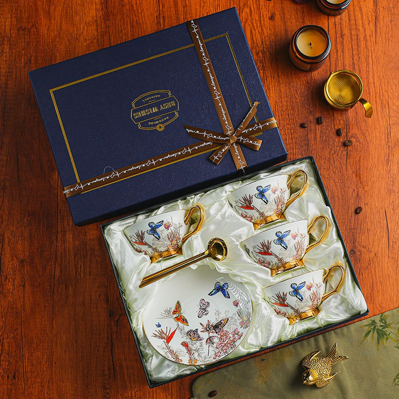 Ceramic Coffee Cups in Gift Box, Butterfly Pattern Porcelain Tea Cup and Saucer Set, British Afternoon Tea Cup and Saucer Set