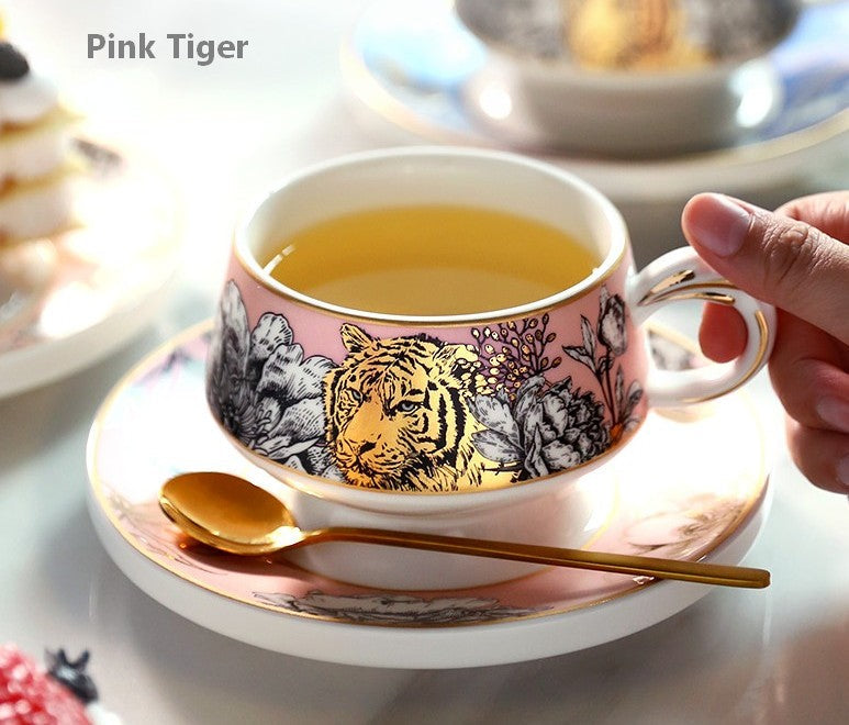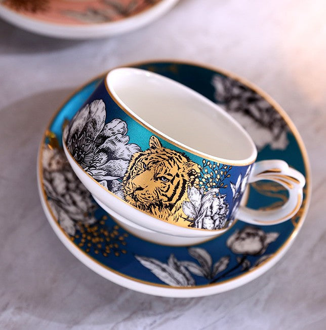 Handmade Ceramic Cups with Gold Trim and Gift Box, Jungle Tiger Cheetah Porcelain Coffee Cups, Creative Ceramic Tea Cups and Saucers