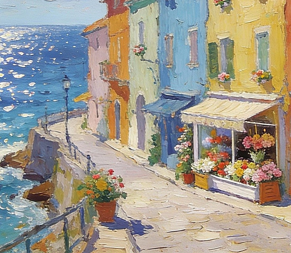 Flower Shop by the Mediterranean, Summer Resort, Hand Painted Canvas Art, Small Landscape Paintings, Original Oil Paintings, Small Wall Art Paintings, Small Paintings on Canvas-Grace Painting Crafts