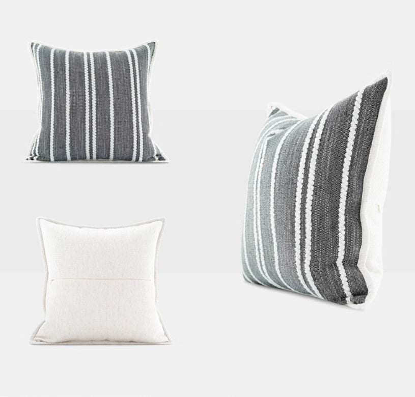 All pillow covers are sewn professionally, over-locked with finished edges to prevent fraying and has invisible zipper enclosures. This provides long lasting, durable covers that will stay straight and beautiful over time, which makes for a clean professional look.