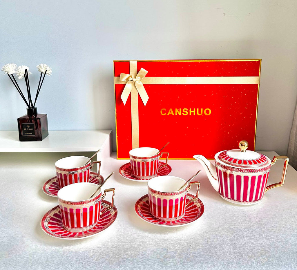 Modern Ceramic Coffee Cups, 7.4 oz Red Tea Cup and Saucer Set of 4 cups with Teapot in Gift Box, Porcelain Tea Cup and Saucer Set